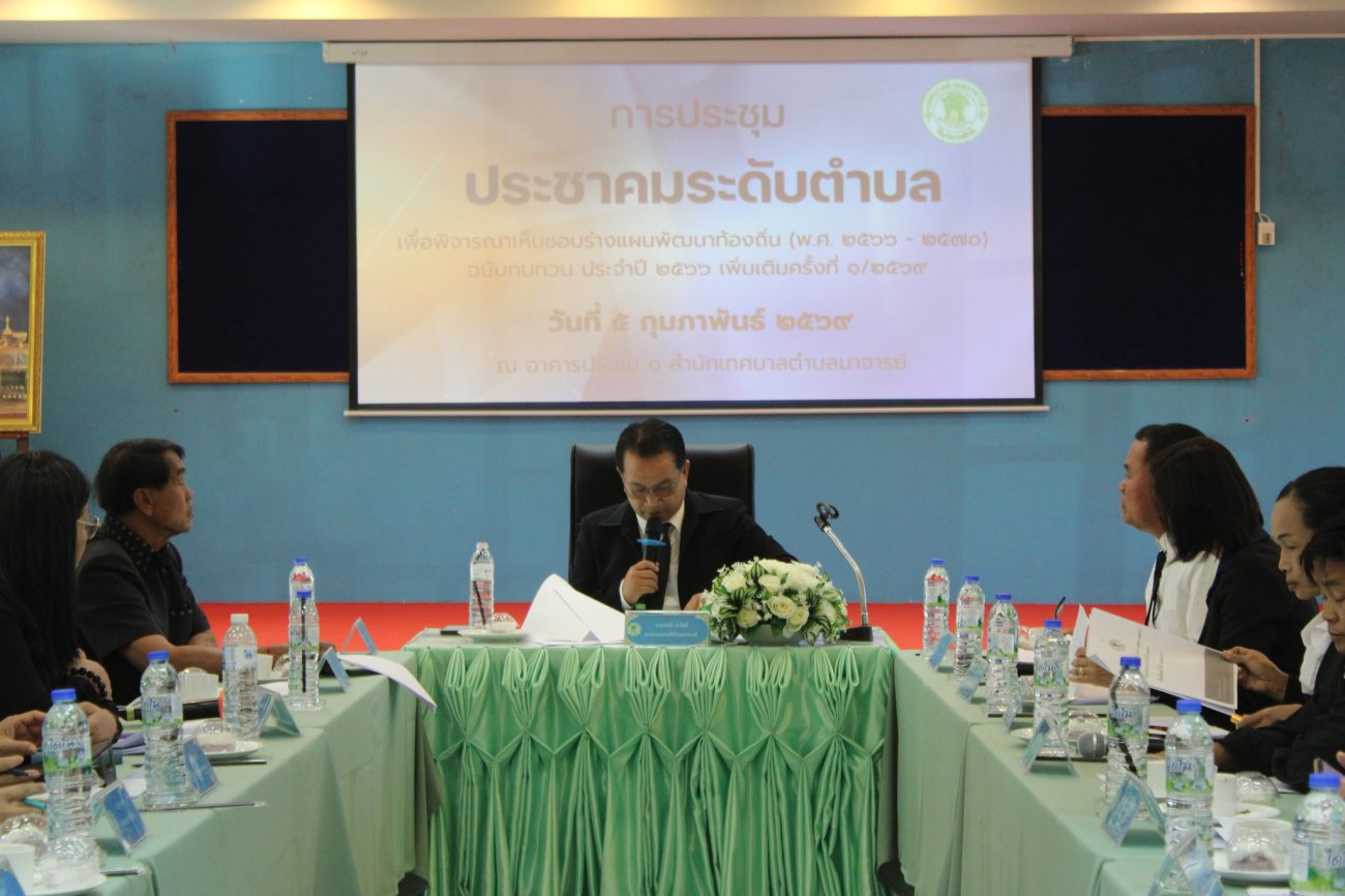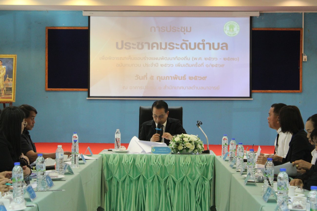 ภาพที่เกี่ยวข้อง เทศบาลตำบลนาจารย์ ได้จัดประชุมประชาคมระดับตำบล เพื่อพิจารณาและให้ความเห็นชอบ ร่างแผนพัฒนาท้องถิ่น (พ.ศ. 2566–2570) ฉบับทบทวน ประจำปี 2566 เพิ่มเติมครั้งที่ 1/2569 วันที่ 5 กุมภาพันธ์ 2569 เวลา 09.00 น. ณ อาคารประชุม 1 เทศบาลตำบลนาจารย์ โดยมี นายสมนึก คำรัศมี นายกเทศมนตรีตำบลนาจารย์ เป็นประธานในที่ประชุม พร้อมด้วยคณะกรรมการพัฒนาท้องถิ่นเทศบาลตำบลนาจารย์ และผู้แทนประชาคมในสัดส่วนต่าง ๆ เข้าร่วมแสดงความคิดเห็นและข้อเสนอแนะ เพื่อพิจารณาให้ความเห็นชอบแผนพัฒนาท้องถิ่น (พ.ศ.2566-2570) ฉบับทบทวน ประจำปี 2566 เพิ่มเติมครั้งที่ 1/2569 เพื่อพัฒนาท้องถิ่นให้สอดคล้องกับความต้องการของประชาชนอย่างแท้จริง