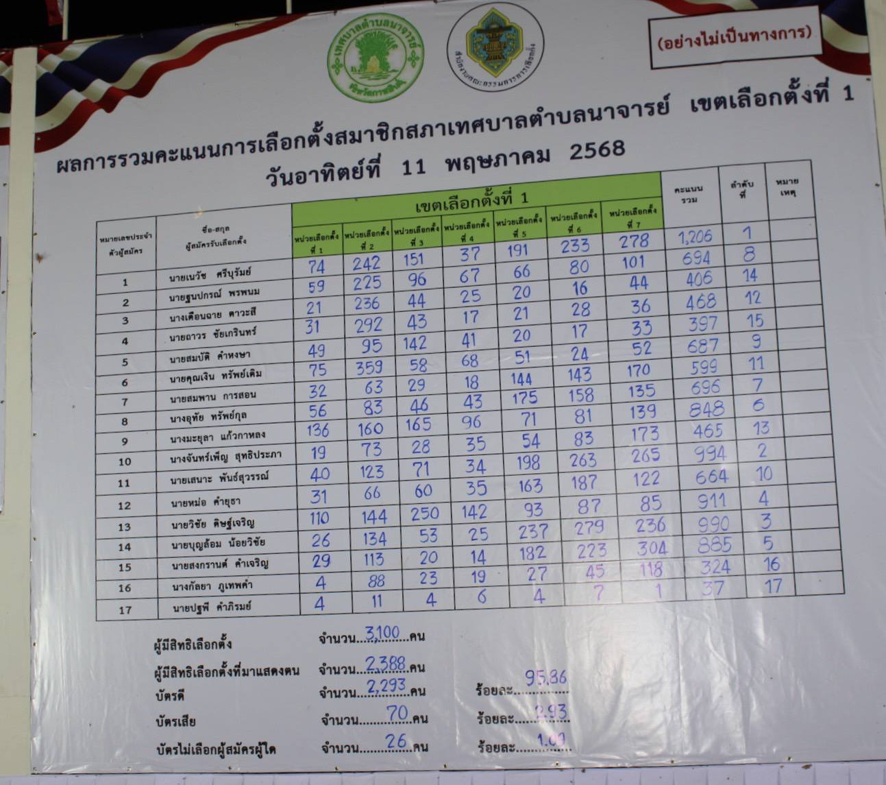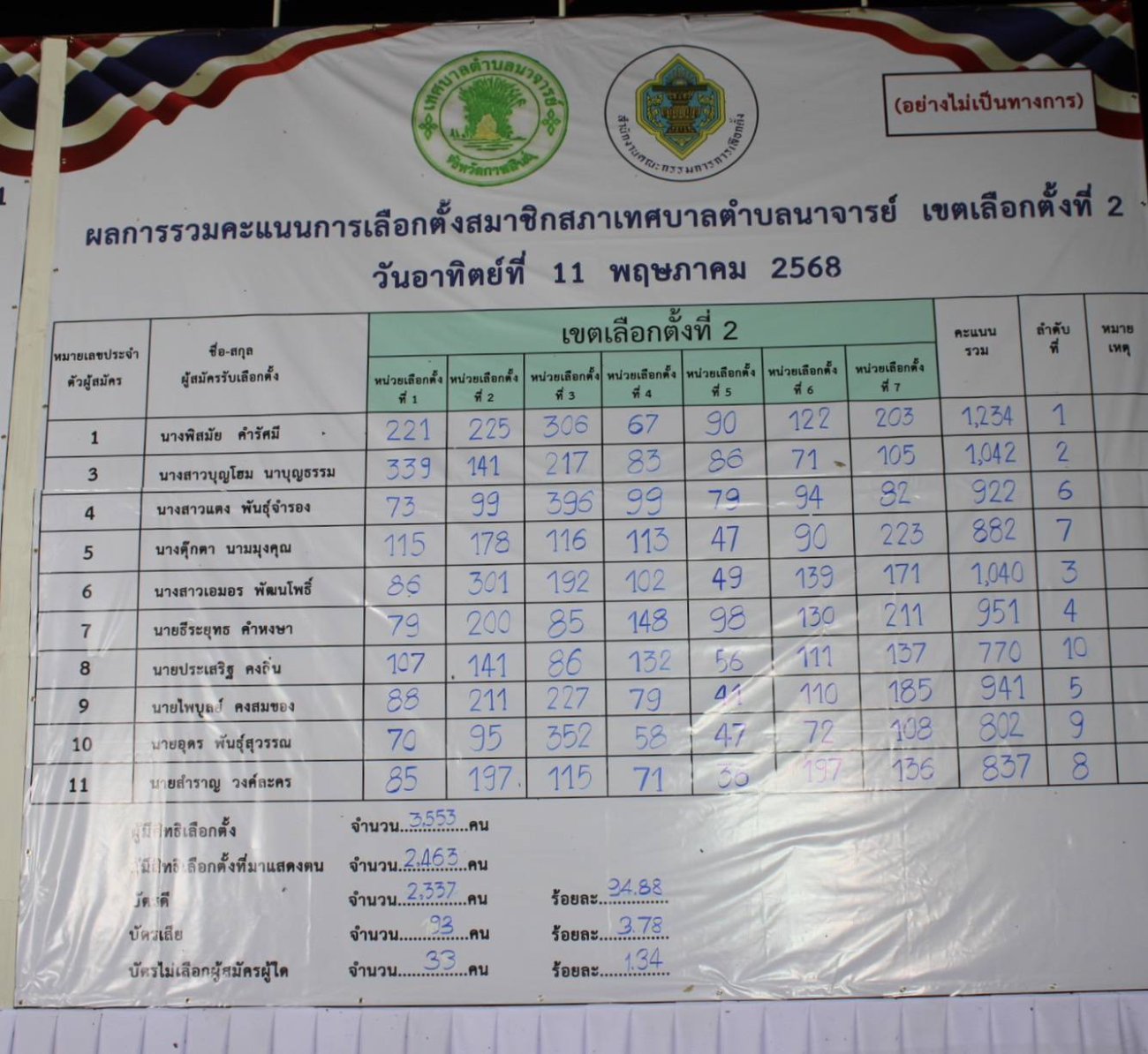ภาพที่เกี่ยวข้อง เลือกตั้งเทศบาล 2568 ผลการเลือกตั้งสมาชิกสภาเทศบาลและนายกเทศมนตรีตำบลนาจารย์ (อย่างไม่เป็นทางการ)